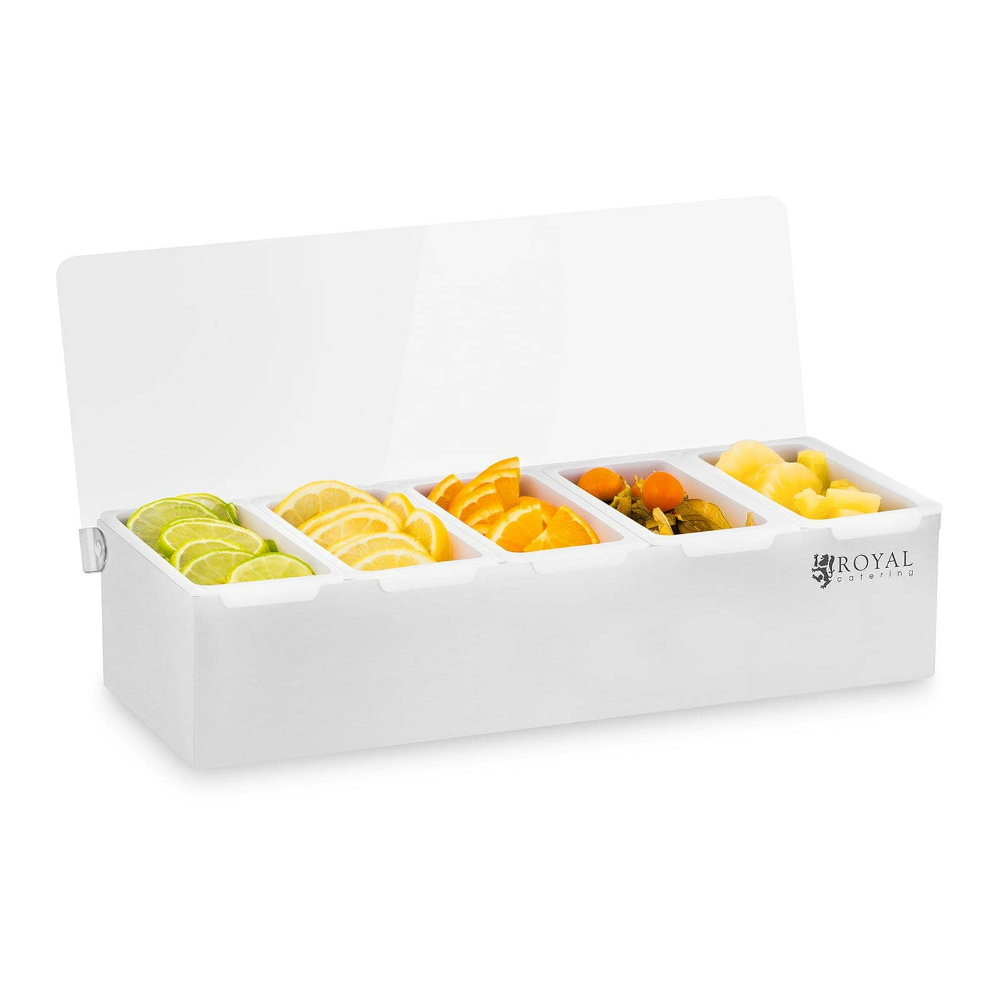 Tous les récipients du présentoir peuvent être retirés indépendamment les uns des autres et ainsi être remplis ou vidés en toute commodité. En outre, le nettoyage des conteneurs en polypropylène est très facile à réaliser, car tous les éléments sont compatibles au lavage en machine. Le présentoir à récipients RCCBP 5 de Royal Catering est ainsi un complément idéal pour le mobilier en inox de toutes les cuisines professionnelles !