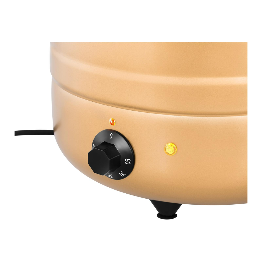 Cette soupière électrique d’une puissance de 400 W et d’une contenance de 10 l est idéale pour vite mettre et maintenir en température les soupes, sauces et boissons chaudes. Réglable en continu sur 35 – 80 °C au moyen d’une molette, elle fonctionne selon le même principe qu’un bain-marie, ce qui signifie qu’elle garde les aliments au chaud sans les faire bruler. L’appareil possède un boitier extérieur qui ne surchauffe pas, c’est pourquoi il est sécuritaire à utiliser.